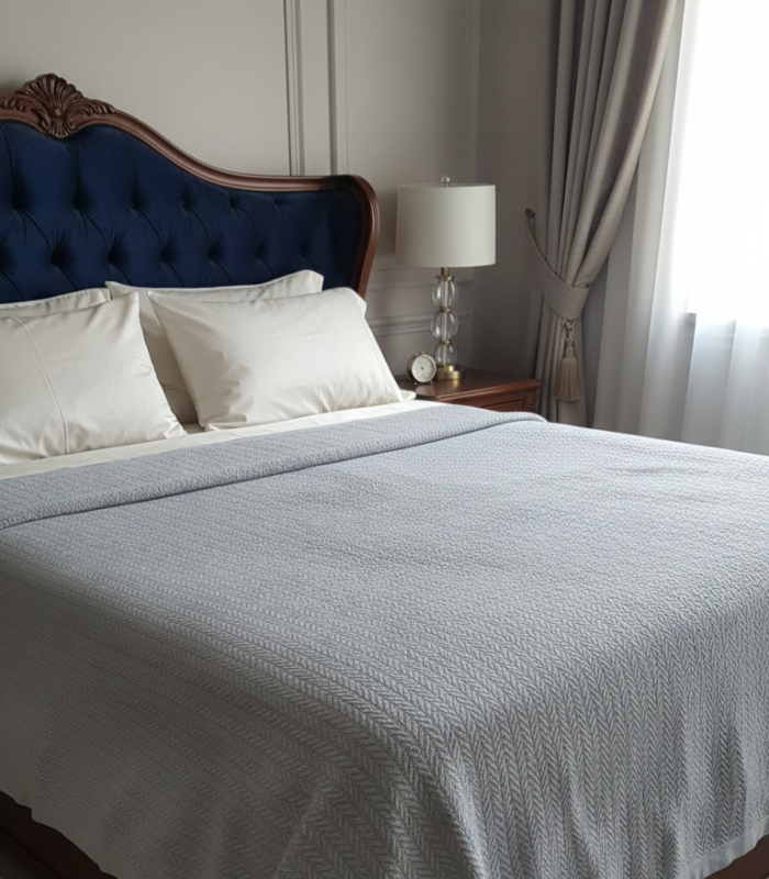 Специалното декоративно шевче прави това покривало за спалня истинско произведение на изкуството. Геометричният мотив добавя текстурна дълбочина и визуален интерес, превръщайки обикновеното покривало в централен декоративен елемент.