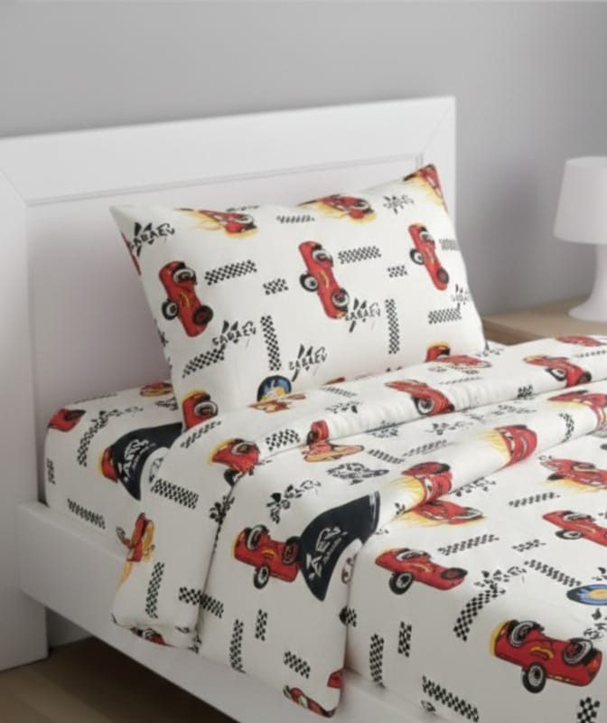 Детско спално бельо с колички от 100% памук ранфорс. Забавният дизайн със състезателни коли ще направи детската стая по-весела, а мекото памучно бельо ще осигури комфортен сън. Комплект 4 части с чаршаф с ластик.