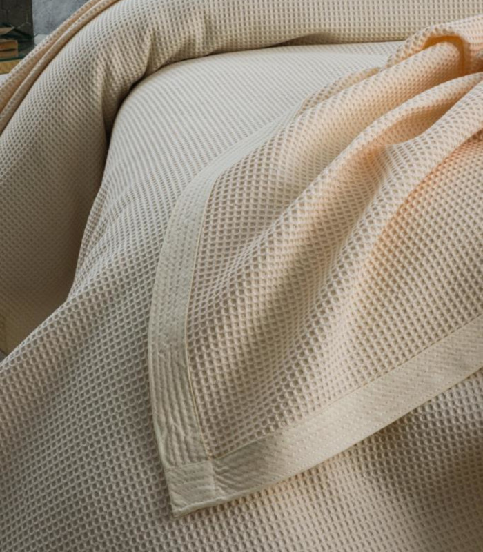 Пчелната структура на това памучно покривало осигурява отлична терморегулация. Уникалният вязел не само добавя визуална привлекателност, но и прави покривалото изключително дишащо и практично за използване през цялата година.