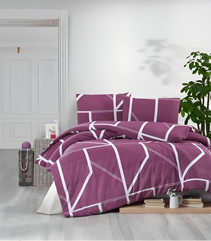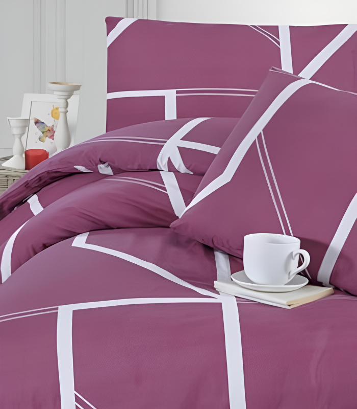 Елегантен спален комплект в лилав цвят от висококачествен памук. Комплектът от 4 части включва плик за завивка, долен чаршаф и две калъфки за максимален комфорт и стил.