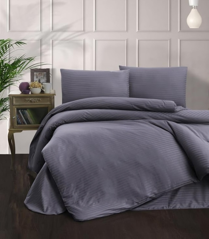 Изискан сатенен спален комплект от 100% памук в антрацитен цвят с фини райета. Луксозно усещане с плътност 83 нишки/см², включва плик, чаршаф и две калъфки за максимален комфорт.