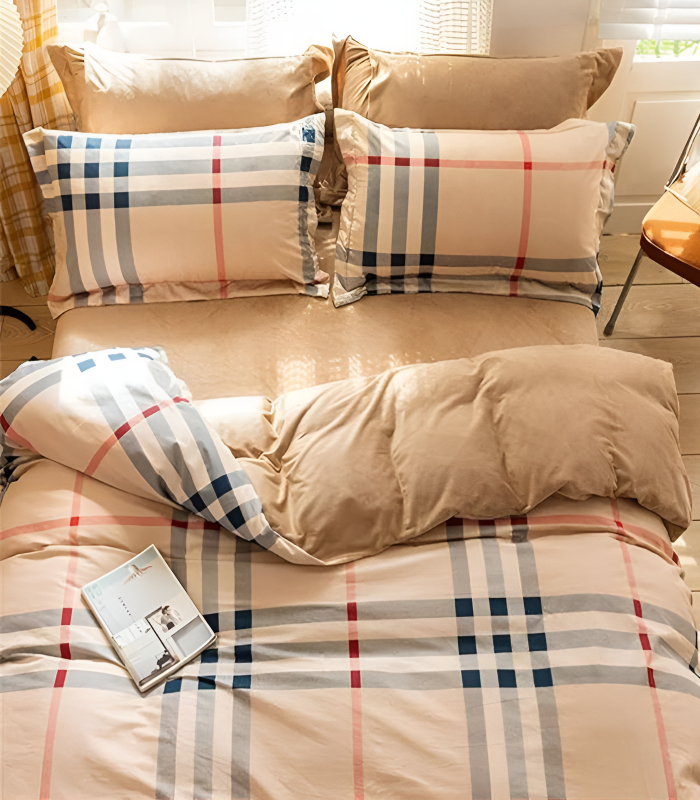 Луксозно спално бельо от 100% органичен памук в елегантен бежов цвят за двойно легло 200×220 см. Четиричастен комплект с удобен ластичен чаршаф и стилни Oxford калъфки. Хипоалергенно и изключително меко за чувствителна кожа.